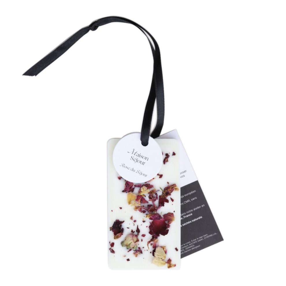 Parfumez votre intérieur de façon éco-responsable et saine avec cette carte en cire à suspendre coulée et décorée à la main dans notre atelier charentais. Notre carte florale à la Rose du Séjour est une suspension en cire végétale de soja qui décore et parfume délicatement vos placards et petits espaces. Accrochée par son ruban de satin ou simplement posée, elle diffusera son parfum de rose pendant plusieurs mois.