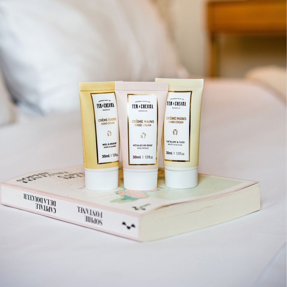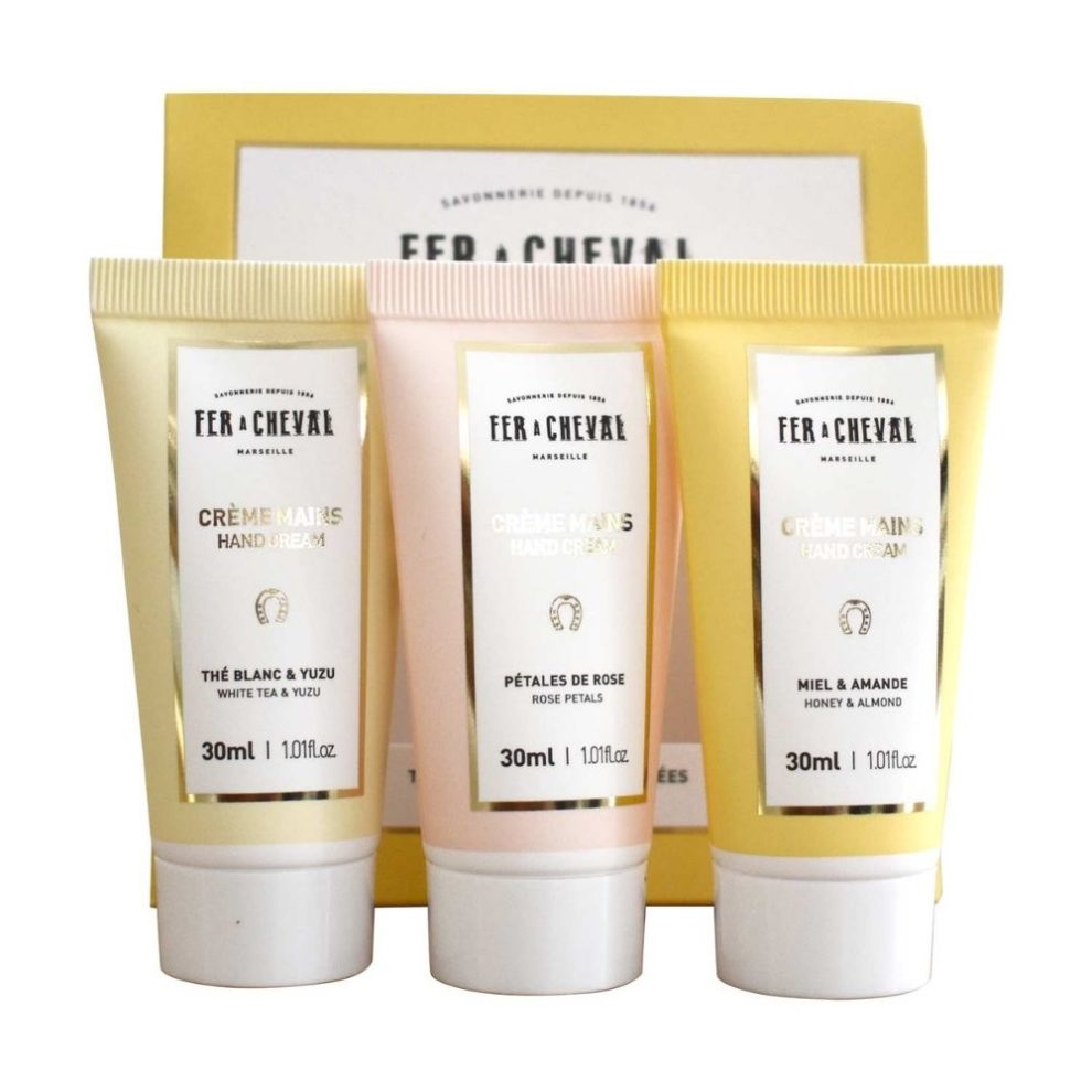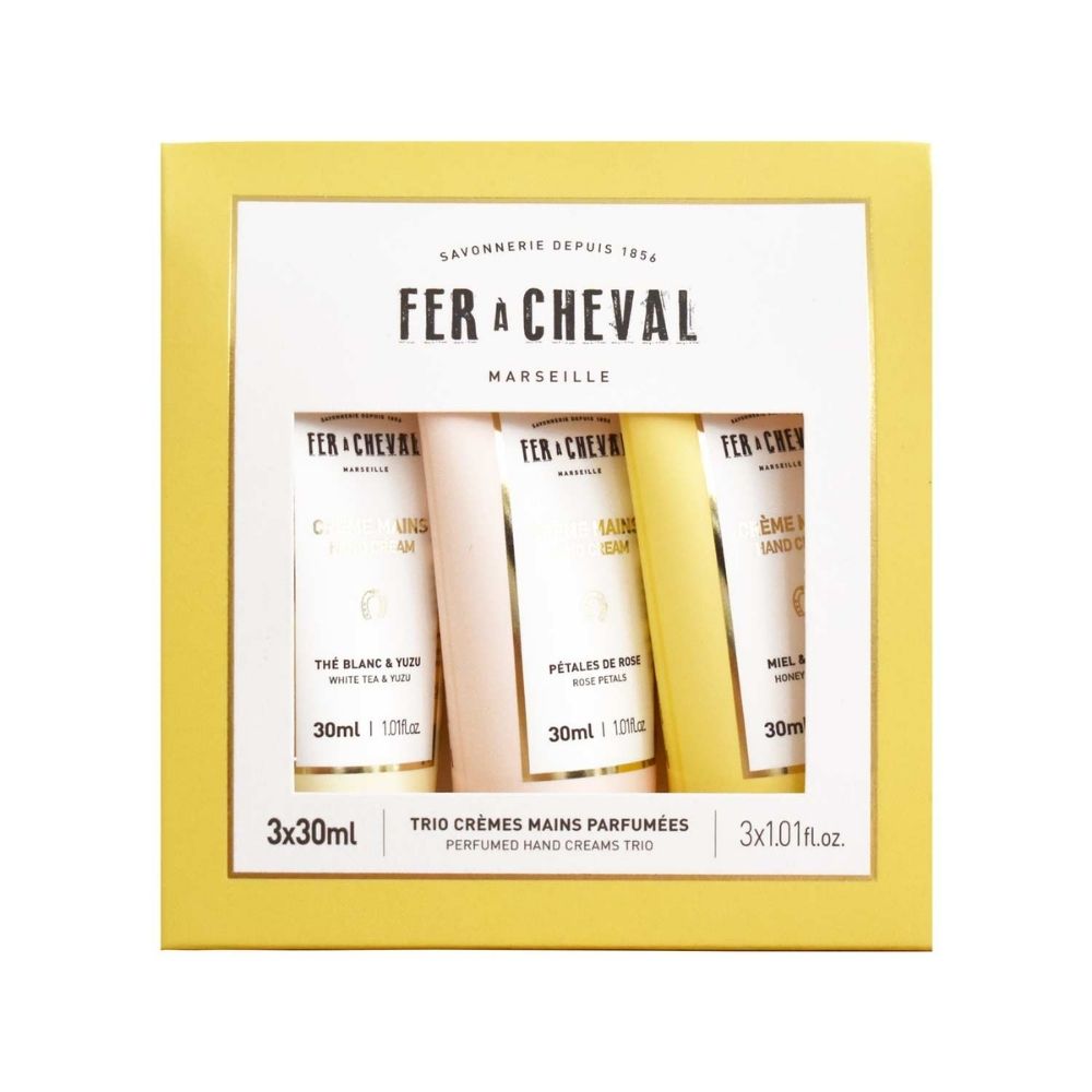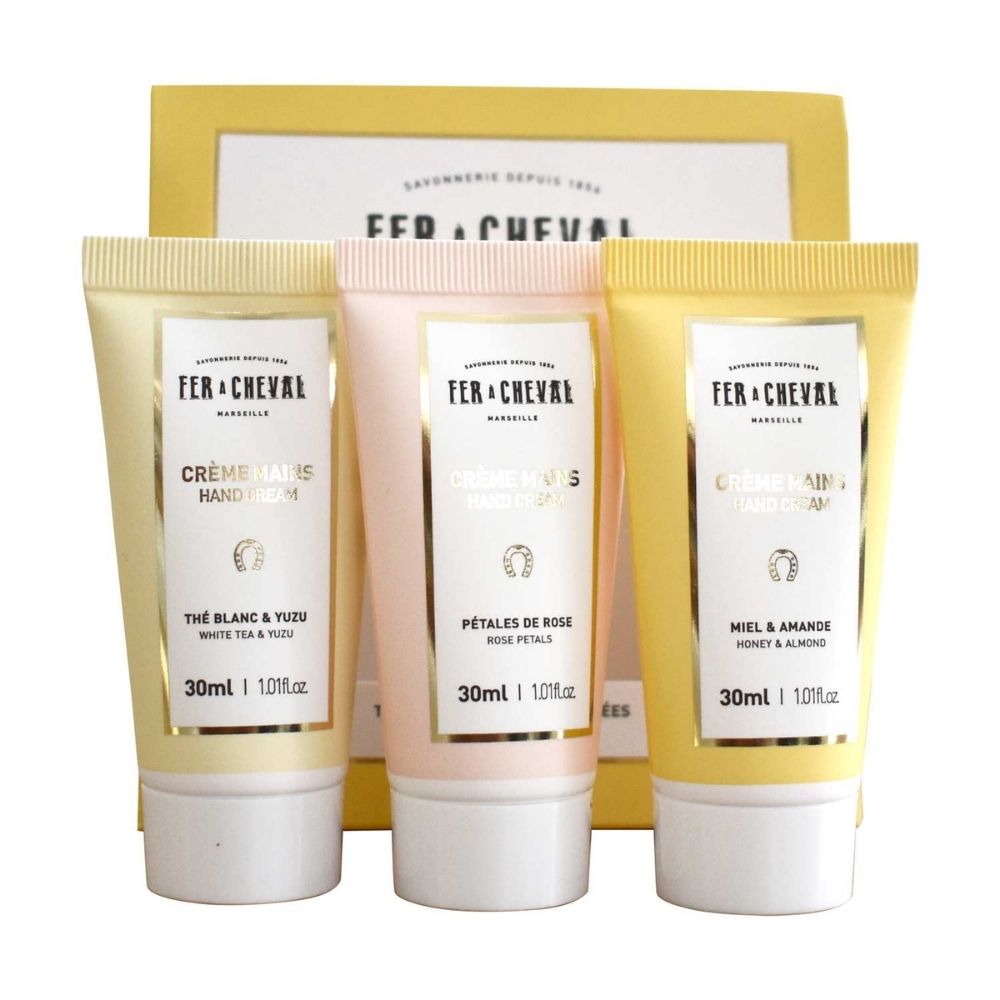 Découvrez les 3 crèmes mains stars de la savonnerie Fer à Cheval dans un coffret unique.