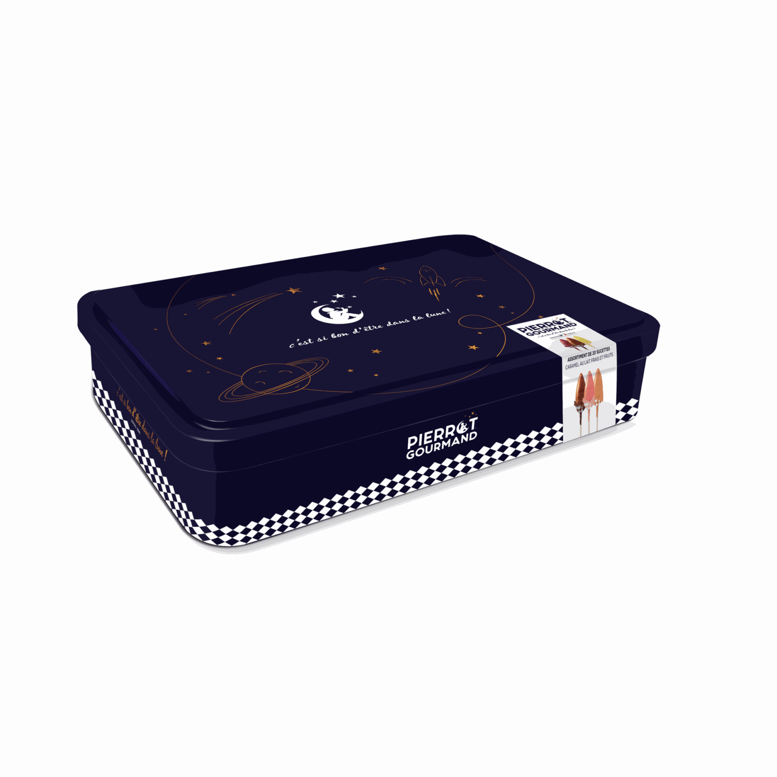 Composée de 10 sucettes saveur fruits et 10 sucettes caramel au lait frais, la boite en métal Pierrot Gourmand est idéale à partager lors de vos goûters et vous transportera dans un moment de rêve et de douceur !
