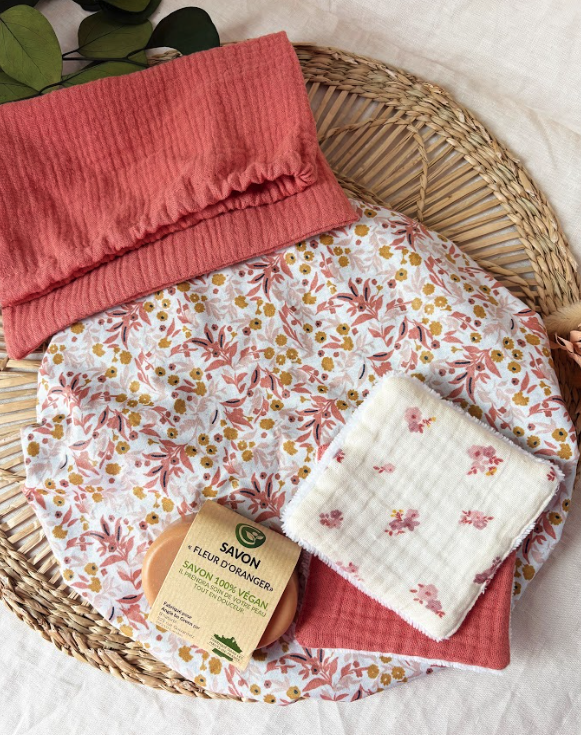 Votre coffret contient : 2 lingettes démaquillantes, un savon à la fleur d’oranger (100g), une charlotte de douche.