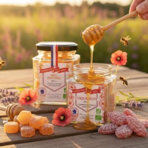 Régalez-vous avec les bonbons gourmands au bon goût de miel de l’entreprise familiale « Les abeilles de Malescot ». Chacune de leurs recettes de bonbons contient 20% du bon miel de nectar bio soigneusement récolté dans le Lot-et-Garonne. Découvrez notre sélection de deux parfums : miel intense et coquelicot.