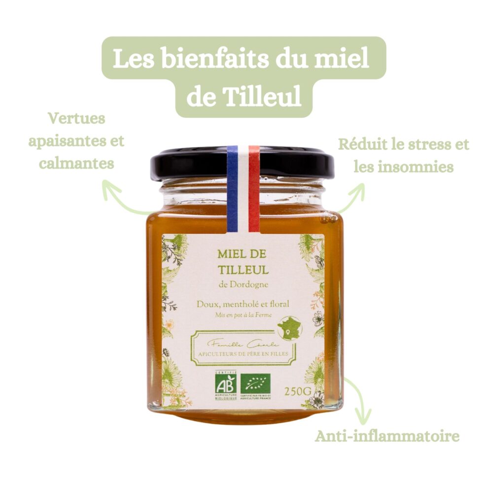 • Le miel de tilleul bio : des notes mentholées alliées aux fleurs de tilleul de Dordogne.