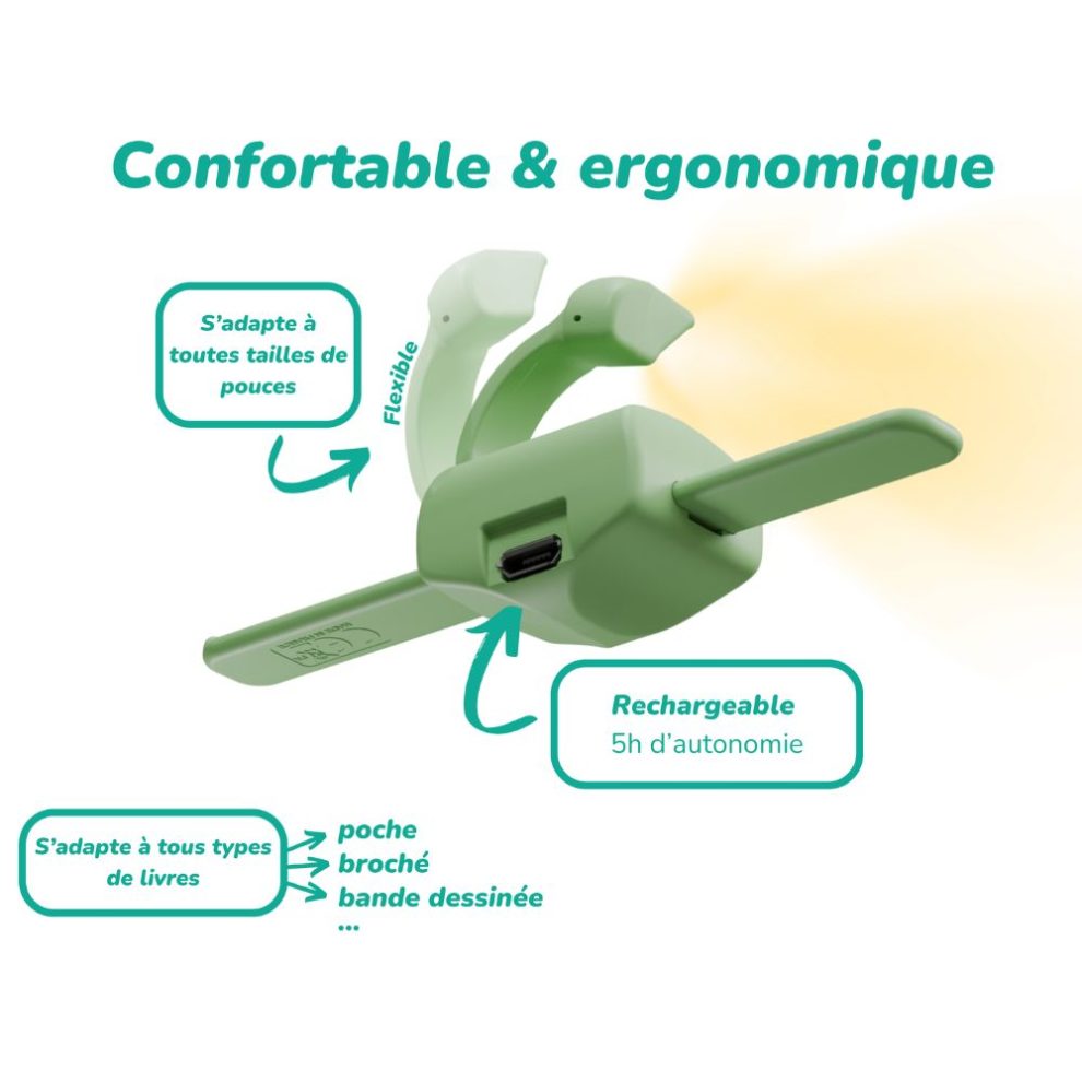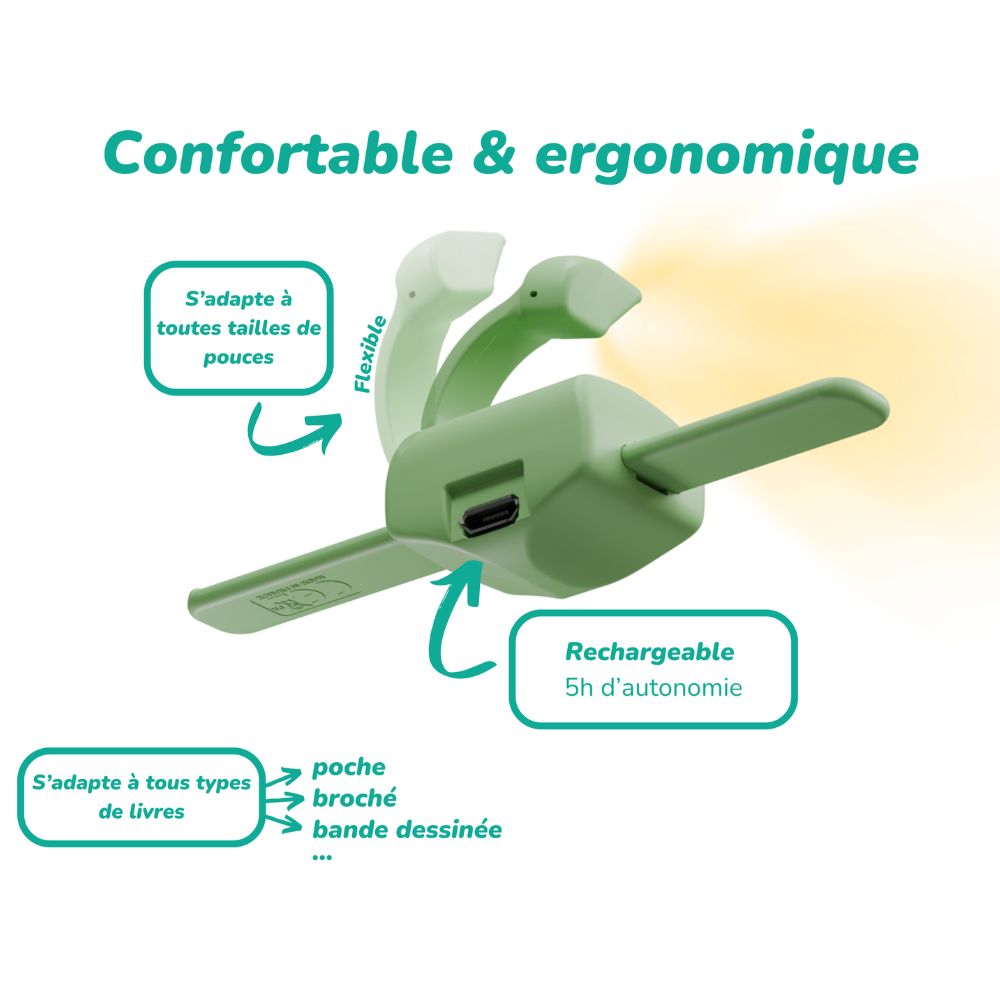 • Lisez confortablement, même d’une seule main :  Fini les bras engourdis en lisant allongé ! Grâce à son design ergonomique, Lizia maintient vos pages ouvertes sans effort. Idéal pour lire au lit, dans les transports ou en voyage. Une lumière douce rien que pour vous Lizia intègre une LED chaude et tamisée qui éclaire uniquement vos pages, sans fatiguer les yeux ni déranger votre entourage. Parfait pour les lectures du soir ou les trajets en train.