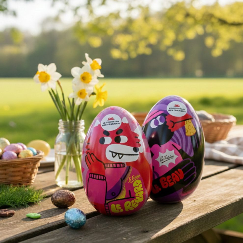 Un écrin illustré qui renferme de petits œufs en chocolat au lait, fourrés au praliné noisettes et rehaussés d’éclats de caramel.