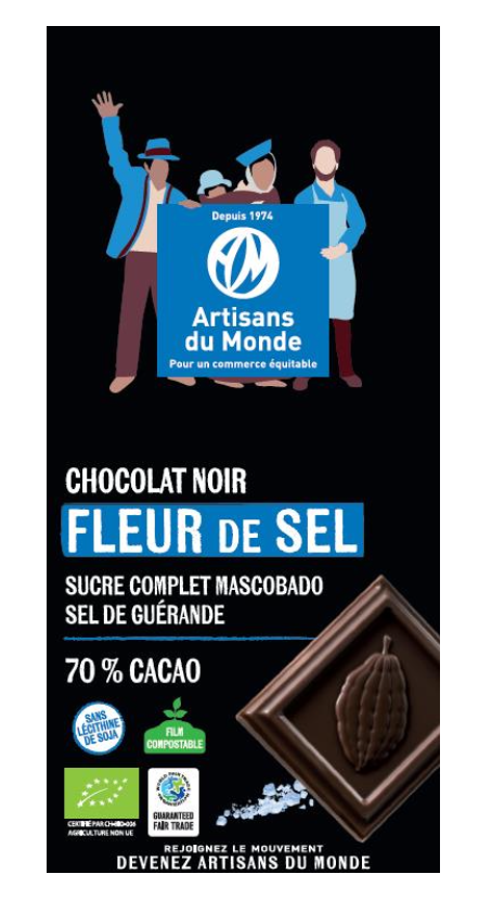 Chocolat noir 70% à la fleur de sel de Guérande issu de l’agriculture biologique et du